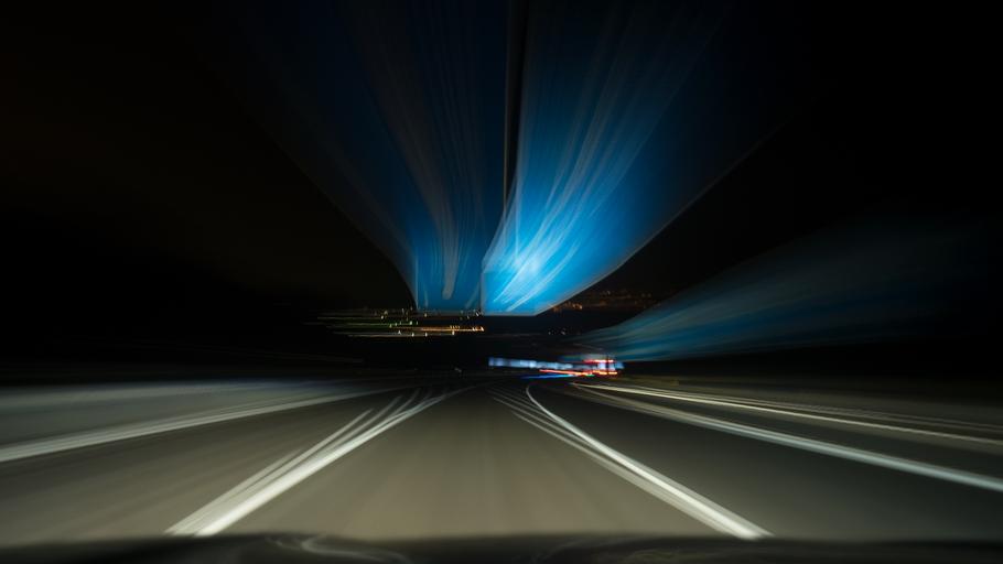 Keywords: road night stelae lights vehicle speed long exposition car highway lane travel signals lead traffic transport asphalt blue signal stripes lines