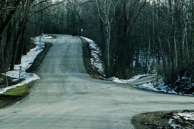 Keywords: road trees winter woods forest rural country turn environment asphalt pavement path route lane travel