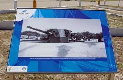 | Keywords: Robben Island Battery 6.jpg en Robben Island Museum display WORLD WAR II DEFENCES Robben Island was occupied by army and naval forces during the Second World War Five large cannons were installed to protect Cape Town harbour from invasion Photograph taken en-route from prison buildings to the harbour at the end of the Robben Island tour 2013-11-28 13 50 52 own HelenOnline cc-by-sa-3 0 PD-South-Africa-exempt Uploaded with UploadWizard Robben Island in World War II User HelenOnline WC | ||||