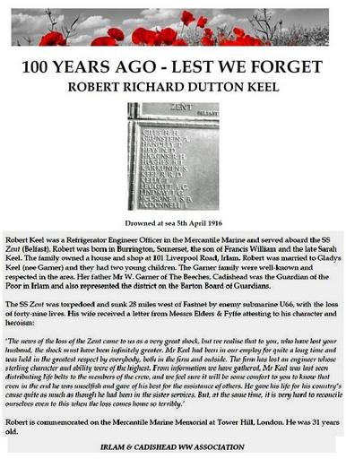 Keywords: text 100 YEARS AGO - LEST WE FORGET - ROBERT RICHARD DUTTON KEEL Robert Keel was a refrigerator Engineer Officer in the Mercantile Marine and served aboard the SS Zent (Belfast). Robert was born in Burrington, Somerset, the son of Francis William and the late Sarah Keel. The family owned a house and shop at 101 Liverpool Road, Irlam. Robert was married to Gladys Keel (nee Garner) and they had two young children. The Garner family were well known and respected in the area. Her late father Mr. W. Garner of the Beeches, Cadishead was the Guardian of the Poor in Irlam and also represented the district on the Barton Board of Guardians. The SS Zent was torpedoed and sunk 28 miles west of Fastnet by enemy submarine U66, with the loss of forty nine lives. His wife received a letter from Messrs Elders & Fyffe attesting to his character and heroism: 'The news of the loss of the Zest came to us as a very great shock, but we realise that to you, who have lost your husband, the shock must have been infinitely greater. Mr Keel had been in our employ for quite a long time and was held in the greatest respect by everybody, both in the firm and outside. The firm has lost an engineer whose sterling character and ability were of the highest. From information we have gathered, Mr Keel was last seen distributing life belts to the members of the crew, and we feel sure it will be some comfort to you to know that even in the end he was unselfish and gave his best for the assistance of others. He gave his life for his country's cause quite as much as though he had been in the sister service. But, at the same time, it is very hard to reconcile ourselves even to this when the loss comes home so terribly.' Robert is commemorated on the Mercantile Marine Memorial at Tower Hill, London. He was 31 years old. IRLAM & CADISHEAD WW ASSOCIATION. 100 YEARS AGO - LEST WE FORGET - ROBERT RICHARD DUTTON KEEL Robert Keel was a refrigerator Engineer Officer in the Mercantile Marine and served aboard the SS Zent (Belfast). Robert was born in Burrington, Somerset, the son of Francis William and the late Sarah Keel. The family owned a house and shop at 101 Liverpool Road, Irlam. Robert was married to Gladys Keel (nee Garner) and they had two young children. The Garner family were well known and respected in the area. Her late father Mr. W. Garner of the Beeches, Cadishead was the Guardian of the Poor in Irlam and also represented the district on the Barton Board of Guardians. The SS Zent was torpedoed and sunk 28 miles west of Fastnet by enemy submarine U66, with the loss of forty nine lives. His wife received a letter from Messrs Elders & Fyffe attesting to his character and heroism: 'The news of the loss of the Zest came to us as a very great shock, but we realise that to you, who have lost your husband, the shock must have been infinitely greater. Mr Keel had been in our employ for quite a long time and was held in the greatest respect by everybody, both in the firm and outside. The firm has lost an engineer whose sterling character and ability were of the highest. From information we have gathered, Mr Keel was last seen distributing life belts to the members of the crew, and we feel sure it will be some comfort to you to know that even in the end he was unselfish and gave his best for the assistance of others. He gave his life for his country's cause quite as much as though he had been in the sister service. But, at the same time, it is very hard to reconcile ourselves even to this when the loss comes home so terribly.' Robert is commemorated on the Mercantile Marine Memorial at Tower Hill, London. He was 31 years old. IRLAM & CADISHEAD WW ASSOCIATION. |