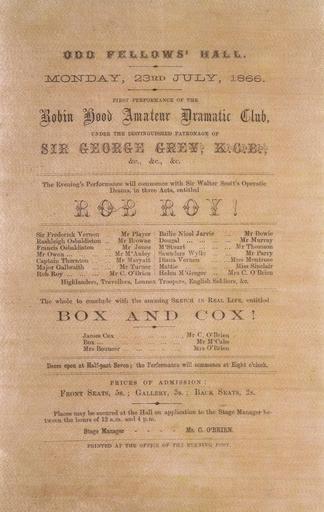 | Keywords: document text writing Arrangement of text, listing the cast of each play. Quantity: 1 b&w art print(s) on silk programme.. Physical Description: Letterpress on pink silk, 203 x 132 mm. Evening Post (Wellington, N.Z.). Robin Hood Amateur Dramatic Club :Odd Fellows' Hall Monday 23rd July 1866. First performance of the Robin Hood Amateur Dramatic Club under the distinguised patronage of Sir George Grey ... "Rob Roy!" ... "Box and Cox!". Printed at the office of the Evening Post. 1866.. Ref: Eph-A-DRAMA-1866-01. Alexander Turnbull Library, Wellington, New Zealand. natlib.govt.nz/records/23226680 Arrangement of text, listing the cast of each play. Quantity: 1 b&w art print(s) on silk programme.. Physical Description: Letterpress on pink silk, 203 x 132 mm. Evening Post (Wellington, N.Z.). Robin Hood Amateur Dramatic Club :Odd Fellows' Hall Monday 23rd July 1866. First performance of the Robin Hood Amateur Dramatic Club under the distinguised patronage of Sir George Grey ... "Rob Roy!" ... "Box and Cox!". Printed at the office of the Evening Post. 1866.. Ref: Eph-A-DRAMA-1866-01. Alexander Turnbull Library, Wellington, New Zealand. natlib.govt.nz/records/23226680 |