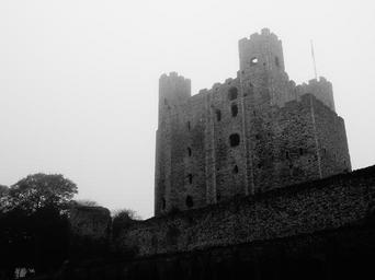 Keywords: blackandwhite monochrome architecture rampart outdoor black and white Rochester Castle stands on the east bank of the River Medway in Rochester, Kent, South East England. The 12th-century keep or stone tower, which is the castle's most prominent feature, is one of the best preserved in England or France. Situated on the River Medway and Watling Street, Rochester served as a strategically important royal castle. During the late medieval period it helped protect England's south-east coast from invasion. The first castle at Rochester was founded in the aftermath of the Norman Conquest. It was given to Bishop Odo, probably by his half-brother William the Conqueror. During the Rebellion of 1088 over the succession to the English throne , Odo supported Robert Curthose, the Conqueror's eldest son, against William Rufus. It was during this conflict that the castle first saw military action; the city and castle were besieged after Odo made Rochester a headquarters for the rebellion. After the garrison capitulated, this first castle was abandoned. Between 1087 and 1089, Rufus asked Gundulf, Bishop of Rochester, to build a new stone castle at Rochester. He established the current extent of the castle. Though much altered through the centuries, some parts of Gundulf's work survive. In 1127 King Henry I granted the castle to the Bishops of Canterbury in perpetuity. William de Corbeil built the massive keep that still dominates the castle today. Throughout the 12th century the castle remained in the custody of the archbishops. During the First Barons' War (1215–1217) in King John's reign, baronial forces captured the castle from Archbishop Stephen Langton and held it against the king, who then besieged it. The Barnwell chronicler remarked "Our age has not known a siege so hard pressed nor so strongly resisted". After resisting for just over seven weeks, the garrison surrendered. Although the castle had been greatly damaged, with breaches in the outer walls and one corner of the keep collapsed, it was hunger that eventually forced the defenders' hand. The castle did not stay under John's control for long: in 1216 it was captured by the French Prince Louis, who was the new leader of the baronial faction. John died and was succeeded by his son King Henry III in 1216; the next year, the war ended and the castle was taken under direct royal control. Rochester was besieged for the third time in 1264 during the Second Barons' War (1264–1267). The castle's royal constable, Roger de Leybourne, held Rochester in support of Henry III. Rebel armies led by Simon de Montfort and Gilbert de Clare entered the city and set about trying to capture the castle. Again the castle's defenders resisted, though this time with a different outcome. After a week, the rebel armies raised the siege in the face of relief from Henry himself. Although the garrison did not surrender, the castle suffered extensive damage that was not repaired until the following century. The castle saw military action for the last time in 1381 when it was captured and ransacked during the Peasants' Revolt. As Rochester Castle fell out of use its materials were reused elsewhere and custodianship relinquished by the Crown. The castle and its grounds were opened to the public in the 1870s as a park. At various points during the 19th and 20th centuries repairs were carried out. The castle is protected as a Grade I listed building and Scheduled Monument. Today the ruins are in the guardianship of English Heritage and open to the public. Rochester Castle stands on the east bank of the River Medway in Rochester, Kent, South East England. The 12th-century keep or stone tower, which is the castle's most prominent feature, is one of the best preserved in England or France. Situated on the River Medway and Watling Street, Rochester served as a strategically important royal castle. During the late medieval period it helped protect England's south-east coast from invasion. The first castle at Rochester was founded in the aftermath of the Norman Conquest. It was given to Bishop Odo, probably by his half-brother William the Conqueror. During the Rebellion of 1088 over the succession to the English throne , Odo supported Robert Curthose, the Conqueror's eldest son, against William Rufus. It was during this conflict that the castle first saw military action; the city and castle were besieged after Odo made Rochester a headquarters for the rebellion. After the garrison capitulated, this first castle was abandoned. Between 1087 and 1089, Rufus asked Gundulf, Bishop of Rochester, to build a new stone castle at Rochester. He established the current extent of the castle. Though much altered through the centuries, some parts of Gundulf's work survive. In 1127 King Henry I granted the castle to the Bishops of Canterbury in perpetuity. William de Corbeil built the massive keep that still dominates the castle today. Throughout the 12th century the castle remained in the custody of the archbishops. During the First Barons' War (1215–1217) in King John's reign, baronial forces captured the castle from Archbishop Stephen Langton and held it against the king, who then besieged it. The Barnwell chronicler remarked "Our age has not known a siege so hard pressed nor so strongly resisted". After resisting for just over seven weeks, the garrison surrendered. Although the castle had been greatly damaged, with breaches in the outer walls and one corner of the keep collapsed, it was hunger that eventually forced the defenders' hand. The castle did not stay under John's control for long: in 1216 it was captured by the French Prince Louis, who was the new leader of the baronial faction. John died and was succeeded by his son King Henry III in 1216; the next year, the war ended and the castle was taken under direct royal control. Rochester was besieged for the third time in 1264 during the Second Barons' War (1264–1267). The castle's royal constable, Roger de Leybourne, held