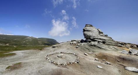 Keywords: rock formation meditation circle gray rock pile landscape