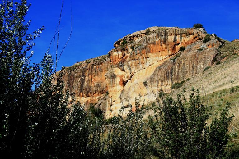 Keywords: rock hill rockface sheer orange earthy slope green bush leaves blue sky summer sunny tree