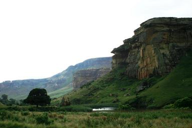 Keywords: rockface sandstone subdued earthy colors cliff green slopes soft light sky after storm water pond tree