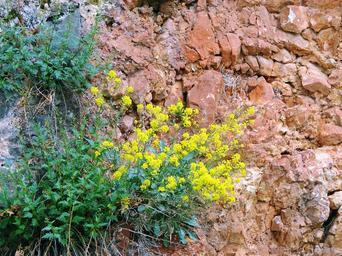 Keywords: rocks cliffs structure texture wildflowers stone terracotta yellow and green nature summer colors colorful plant sunny desert and life bloom wild plant