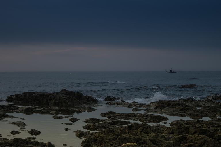 Keywords: rocks sea horizon costa wave splash blue clouds boat fisherman shore dawn cliff