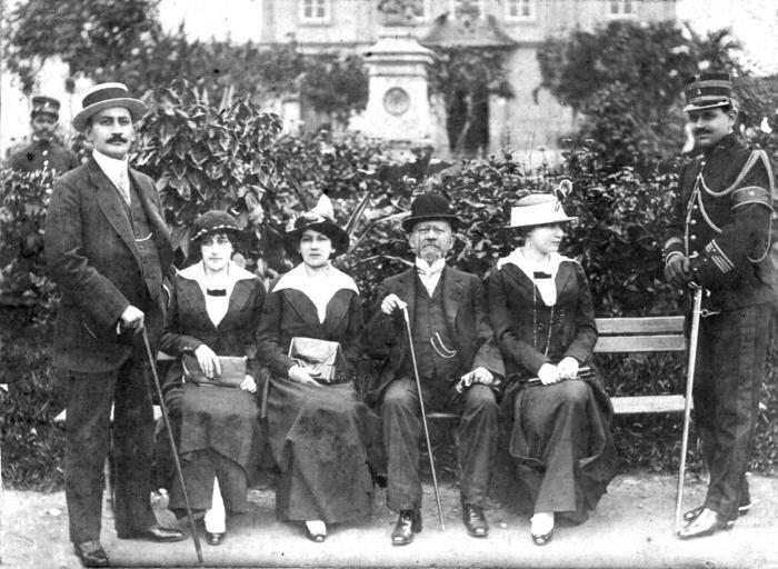 | Keywords: Rodrigues Alves e família em Aparecida.jpg Conselheiro Rodrigues Alves presidente do Brasil de 1902 a 1906 e família na antiga igreja de Aparecida em 1913 <br/> Legenda Da esquerda para a direita Oscar Rodrigues Alves Isabel Rodrigues Alves Maria Rodrigues Alves Conselheiro Francisco de Paula Rodrigues Alves Zaïra Rodrigues Alves e capitão Eduardo Lejeune ajudante de ordens Acervo da família Rodrigues Alves 1913 author PD-BR-1937 Rodrigues Alves People of Aparecida Files by User Dantadd Families of Brazil Fashion in 1913 1913 in Brazil Military people in the 20th century Military people of Brazil Three-piece suits |