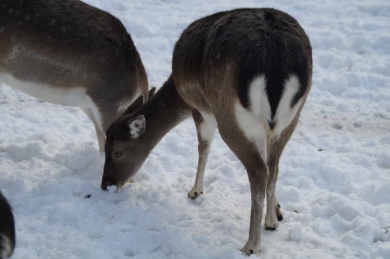 Keywords: roe deer fallow deer wild winter snow winter fur wintry cold white snowy animal mammal zoo petting zoo enclosure deer park mirror rump ricke