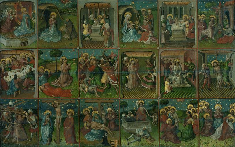 Keywords: Roermondse passie.jpg Artwork LangSwitch Achtzehn Szenen aus dem Leben Christi bekannt als die Roermonder Passion <ref>https //www rijksmuseum nl/collectie/SK-A-1491 Achttien taferelen uit het leven van Christus bekend als de Roermondse passie - Rijksmuseum Amsterdam - National Museum for Art and History Titel übersetzt von Wikimedia Commons </ref> Eighteen scenes from the life of Christ known as the Roermond Passion <ref>https //www rijksmuseum nl/collectie/SK-A-1491 Achttien taferelen uit het leven van Christus bekend als de Roermondse passie - Rijksmuseum Amsterdam - National Museum for Art and History </ref> Dix-huit épisodes de la vie du Christ dit la Passion de Roermond <ref>https //www rijksmuseum nl/collectie/SK-A-1491 Achttien taferelen uit het leven van Christus bekend als de Roermondse passie - Rijksmuseum Amsterdam - National Museum for Art and History titre traduit par Wikimedia Commons </ref> Achttien taferelen uit het leven van Christus bekend als de Roermondse passie <ref>https //www rijksmuseum nl/collectie/SK-A-1491 Achttien taferelen uit het leven van Christus bekend als de Roermondse passie - Rijksmuseum Amsterdam - Nationaal Museum voor Kunst en Geschiedenis </ref> Alternate titles LangSwitch Roermonder Passion <ref>http //www rkd nl/rkddb/dispatcher aspx action search database ChoiceImages search priref 29140 RKDimages Art-work number 29140 Titel übersetzt von Wikimedia Commons </ref> Eighteen scenes from the life of Christ <ref name RKD >http //www rkd nl/rkddb/dispatcher aspx action search database ChoiceImages search priref 29140 RKDimages Art-work number 29140 title translated by Wikimedia Commons </ref> <br />Roermond Passion <ref name RKD /> Dix-huit épisodes de la vie du Christ <ref name RKD >http //www rkd nl/rkddb/dispatcher aspx action search database ChoiceImages search priref 29140 RKDimages Œuvre d'art numéro 29140 titre traduit par Wikimedia Commons </ref> <br />Passion de Roermond <ref name RKD /> Achttien episoden uit het leven van Christus <ref name RKD >http //www rkd nl/rkddb/dispatcher aspx action search database ChoiceImages search priref 29140 RKDimages Kunstwerknummer 29140 </ref> <br />Roermondse Passie <ref name RKD /> LangSwitch Öl auf Leinwand auf Holz Huile sur toile sur bois Olieverf op doek op paneel Oil on canvas on panel cm 103 167 5 Amsterdam Rijksmuseum Provenance ~ 1435 commission Bela van Mirlaer van Millendonck LangSwitch Zisterzienserinnenkonvent Couvent cistercien Cistercian convent Cisterciënzerinnenklooster Roermond by 1831 LangSwitch Onze-Lieve-Vrouwe-Munsterkerk Kirche Onze-Lieve-Vrouwe-Munsterkerk church Onze-Lieve-Vrouwe-Munsterkerk église Onze-Lieve-Vrouwe-Munsterkerk Roermond by 1879 LangSwitch North Gallery Noordelijke gallerij Onze-Lieve-Vrouwe-Munsterkerk Roermond ProvenanceEvent 1880 loan LangSwitch the au het Nederlandsch Museum voor Geschiedenis en Kunst 4843 The Hague ProvenanceEvent 1889-03 purchase LangSwitch vom the het Rijksmuseum SK-A-1491 Amsterdam LangSwitch die the de Onze-Lieve-Vrouwe-Munsterkerk Roermond www rijksmuseum nl http //www rijksmuseum nl/ lang en Home http //www rijksmuseum nl/aria/aria_assets/SK-A-1491 lang en Info http //www rijksmuseum nl/images/aria/sk/z/sk-a-1491 z Pic SK-A-1491 ~ 1435 1430-1440 Anonymous LangSwitch Geldern Guelders Gueldre Gelre Other versions PD-old-100 LangSwitch Hinweis References Notes Noten <references /> ImageNote 1 544 678 270 326 1600 1006 2 270px<br /> File Roermondse passie detail jpg<br /> LangSwitch Detail Lamentation of Christ with donor portrait of Bela van Mirlaer van Millendonck abbess of the Cistercian convent of the Virgin Mary in Roermond from 1447 Detail Bewening van Christus met donorportret van Bela van Mirlaer van Millendonck abdis van het Onze Lieve Vrouwe Cisterciënzerinnenklooster in Roermond vanaf 1447 ImageNoteEnd 1 1430s paintings Life and teachings of Jesus Christ Early Netherlandish paintings in the Rijksmuseum Amsterdam Anonymous Interior of Munsterkerk Roermond |