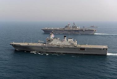 | Keywords: ROKS Dokdo (LPH 6111) and USS Bonhomme Richard (LHD-6) underway in March 2014.JPG en The Republic of Korea amphibious assault ship ROKS Dokdo LPH 6111 assigned to Commander Flotilla COMFLOT 5 transits alongside the U S Navy amphibious assault ship USS Bonhomme Richard LHD-6 and other ships from COMFLOT-5 and the Bonhomme Richard Amphibious Ready Group during a photo exercise as part of Exercise Ssang Yong The annual combined exercise is conducted by Navy and Marine forces with the Republic of Korea in order to strengthen interoperability across the range of military operations 2014-03-27 140327-N-BJ178-476 Navy http //www navy mil/view_image asp id 173956 U S Navy photo by Mass Communication Specialist 2nd Class Michael Achterling PD-USGov-Military-Navy ROKS Dokdo LPH 6111 General views of USS Bonhomme Richard LHD-6 |