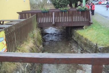 Keywords: Rokytka u muzea.JPG cs Dřevěné můstky přes Rokytku mezi orlojem a muzeem betlémů own Zákupák 2014-12-14 Kryštofovo Údolí Rokytka Lusatian Neisse tributary Bridges in Liberec District