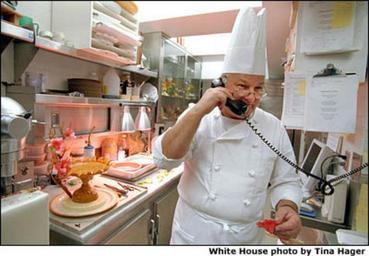 | Keywords: Roland Mesnier in the White House kitchen.jpg Roland Mesnier prepares the State dinner dessert a mango and coconut ice cream dome with Peaches White House White House Tina Hager PD-USGov Roland Mesnier Photographs by Tina Hager White House kitchen Desserts of the United States Men on telephone calls State dinners Pastry chefs |