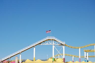 Keywords: rollercoaster flag usa sky blue cloudless bright amusement park coaster fair summer entertainment