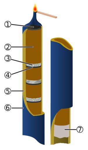 | Keywords: Roman candle structure drawing.svg en Drawing of the internal structure of a roman candle fireworks Version with numeric labels Legend Ignition charge easily ignited explosive powder Delay charge slowly burning powder Pyrotechnic star colorfully burning metal multiple stars of different kinds Lift charge explosive to launch the star out of the tube Cardboard tube Wrapping paper acts also as ignition fuse Seal clay own Petteri Aimonen 2009-12-12 Image Roman candle structure drawing-en svg Firecrackers Cutaway diagrams |