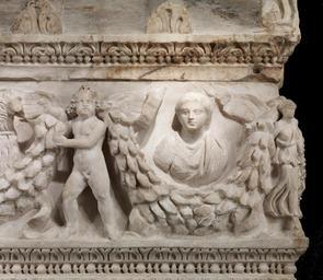 | Keywords: Roman - Garland Sarcophagus - Walters 2329 - Detail B.jpg Unlike many sarcophagi this one is carved on all four sides in high relief Garlands held by winged goddesses or personifications on the corners and Eros Cupid figures on the sides support the busts of a crowned deity left and a young girl right The sarcophagus was probably intended for her In the center on both the front and back is a theatrical mask-on this side Tragedy on the other Comedy Medusa heads decorate the ends The lid takes the form of a temple roof with a pediment triangular gable at each end This sarcophagus can be traced to a particular workshop active near the ancient quarry of Dokimeion in Phrygia in Asia Minor Its discovery in Rome illustrates the long-distance trade in even very large heavy luxury goods that took place at the height of the Roman Empire between 150 180 Imperial Dokimeion marble cm 83 5 143 35 69 85 accession number 23 29 30186 Excavated from the so-called Licinian tomb Rome 1885 Don Marcello Massarenti Collection Rome 1885 by excavation Henry Walters city Baltimore Walters Art Museum Henry Walters Acquired by Henry Walters with the Massarenti Collection 1902 Treasures of Heaven The Cleveland Museum of Art Cleveland; The Walters Art Museum Baltimore; The British Museum London 2010-2011 place of origin Phrygia in present-day Turkey Walters Art Museum license Ancient Roman art in the Walters Art Museum Media contributed by the Walters Art Museum needs category review |