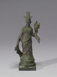 | Keywords: Roman - Isis-Fortuna - Walters 54751.jpg Each Roman household had a lararium or household shrine in which small bronze figurines of deities including lares the divinities protecting the house were displayed The master of the house would make daily offerings at the shrine as well as more ceremonial offerings on important occasions This small figurine was found together with five others Walters 54 752 54 748 54 750 54 2290 and 54 749 in a lararium at Boscoreale the site of a Roman villa near Pompeii A Genius or priest stood before the household deities Isis-Fortuna Mercury a seated Jupiter Alexander Helios and a standing Jupiter These were divinities the family particularly venerated for the continuing good fortune of the household century 1 AD cast bronze with base cm 11 43 5 24 3 49 accession number 54 751 40870 De Prisco Boscoreale/Canessa 1906 by excavation Henry Walters Baltimore 1906 mode of acquisition unknown Walters Art Museum Henry Walters Acquired by Henry Walters 1906 Pompeii and The Roman Villa National Gallery of Art Washington; Los Angeles County Museum of Art Los Angeles 2008-2009 place of origin Roman Empire Walters Art Museum license Ancient Roman bronze statuettes from Boscoreale in the Walters Art Museum Media contributed by the Walters Art Museum needs category review |