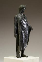 | Keywords: Roman - Mercury - Walters 54605 - Three Quarter Right.jpg The wings one missing on the head of this figure identify it as representing Mercury the messenger of the gods It is exquisitely detailed and larger than most statuettes made for household worship suggesting that it was prominently displayed within the villa of a wealthy Roman family The hairstyle dates the piece to the mid 1st century when artists were still very much influenced by the Classical style of Greek art His left hand would have held the caduceus or herald's staff that is his attribute familiar today as a medical symbol AD 40-80 Julio-Claudian ; Flavian cast bronze with silver coat and inlay cm 29 2 11 8 5 6 accession number 54 605 25406 Henry Walters Baltimore date and mode of acquisition unknown Walters Art Museum Henry Walters Acquired by Henry Walters The Gods Delight The Human Figure in Classical Bronze The Cleveland Museum of Art Cleveland 1988-1989 place of origin Roman Empire Walters Art Museum license Ancient Roman sculptures in the Walters Art Museum Ancient Roman bronze statuettes of Mercurius Media contributed by the Walters Art Museum needs category review |