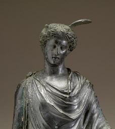 | Keywords: Roman - Mercury - Walters 54605 - Detail A.jpg The wings one missing on the head of this figure identify it as representing Mercury the messenger of the gods It is exquisitely detailed and larger than most statuettes made for household worship suggesting that it was prominently displayed within the villa of a wealthy Roman family The hairstyle dates the piece to the mid 1st century when artists were still very much influenced by the Classical style of Greek art His left hand would have held the caduceus or herald's staff that is his attribute familiar today as a medical symbol AD 40-80 Julio-Claudian ; Flavian cast bronze with silver coat and inlay cm 29 2 11 8 5 6 accession number 54 605 25406 Henry Walters Baltimore date and mode of acquisition unknown Walters Art Museum Henry Walters Acquired by Henry Walters The Gods Delight The Human Figure in Classical Bronze The Cleveland Museum of Art Cleveland 1988-1989 place of origin Roman Empire Walters Art Museum license Ancient Roman sculptures in the Walters Art Museum Ancient Roman bronze statuettes of Mercurius Media contributed by the Walters Art Museum needs category review |