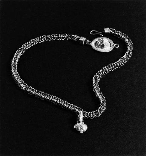 | Keywords: Roman - Necklace with Pendant of a Female Bust and Head of Medusa or Helios on Clasp - Walters 57521.jpg The pendant on this chain link necklace is decorated with filigree and granulation century 2 gold cm 34 93 l ; pendant cm 2 diam accession number 57 521 13235 Collection of F G Hilton-Price date and mode of acquisition unknown Henry Walters Baltimore date and mode of acquisition unknown Walters Art Museum Henry Walters Acquired by Henry Walters Jewelry - Ancient to Modern The Walters Art Gallery Baltimore 1979-1980 place of origin Roman Empire Walters Art Museum license Ancient Roman art in the Walters Art Museum Jewellery in the Walters Art Museum Ancient Roman necklaces Media contributed by the Walters Art Museum needs category review |