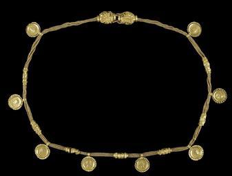 | Keywords: Roman - Necklace with Pendant Coins - Walters 571600.jpg The gold necklace is composed of four braided chains They are gathered together and after passing through two large beads cross over to the opposite bead where the ends are secured The ends of the chains are fitted through holes crudely punched into the sides of the beads and are fastened by buttons inside The overlapping chains give the impression that part of the necklace has eight chains The length of the necklace can be adjusted by sliding the chains through the beads thereby altering the amount of overlap The beads are faceted and ornamented with rosettes palmettes and scallop shells Collars keep the open ends from fraying early Other date century 3 gold when doubled cm 47 5 2 4 h x d ; average medallion cm 2 75 diam accession number 57 1600 39587 Adolph Schiller Berlin 1929 mode of acquisition unknown Henry Walters New York date and mode of acquisition unknown Sadie Jones Mrs Henry Walters New York 1931 by inheritance Mrs Henry Walters Sale Parke-Bernet Galleries Inc New York May 2 1941 lot 1313 Walters Art Museum 1941 by purchase Museum purchase formerly part of the Walters Collection 1941 Early Christian and Byzantine Art Baltimore Museum of Art Baltimore 1947 Jewelry - Ancient to Modern The Walters Art Gallery Baltimore 1979-1980 Objects of Adornment Five Thousand Years of Jewelry from the Walters Art Gallery Baltimore Cooper-Hewitt National Design Museum New York; Chrysler Museum of Art Norfolk; Carnegie Museum of Art Pittsburgh; San Antonio Museum of Art San Antonio; Philbrook Museum of Art Tulsa; Honolulu Academy of Arts Honolulu; New Orleans Museum of Art New Orleans; Milwaukee Art Museum Milwaukee; Minneapolis Institute of Arts Minneapolis; Toledo Museum of Art Toledo; The John and Mable Ringling Museum of Art Sarasota 1984-1987 Jewelry from the Walters Art Museum and the Zucker Family Collection The Walters Art Gallery Baltimore 1987 Coins and Costume in Late Antiquity Dumbarton Oaks Washington 1993-1994 place of origin Roman Empire Walters Art Museum license Ancient Roman art in the Walters Art Museum Jewellery in the Walters Art Museum Ancient Roman necklaces Braids |