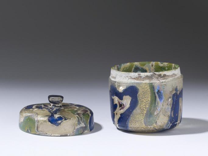 | Keywords: Roman - Pyxis - Walters 4776.jpg This pyxis or cylindrical box is an exquisite example of Roman luxury glassware used to hold cosmetics or precious jewelry late 1st century BC Augustan glass gold leaf with cover cm 4 91 4 06 h x diam accession number 47 76 14002 Found near Jerusalem Dikran Kelekian New York and Paris Henry Walters city Baltimore Walters Art Museum Henry Walters Acquired by Henry Walters 1924 3000 Years of Glass Treasures from The Walters Art Gallery The Walters Art Gallery Baltimore 1982 place of origin east Mediterranean Walters Art Museum license Ancient Roman glassware in the Walters Art Museum 1st-century BC art in the United States Glass Ancient Roman pyxides Ancient Roman golden glasses |
