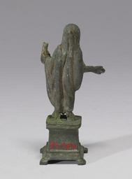 | Keywords: Roman - Sacrificing Priest - Walters 54752 - Back.jpg Each Roman household had a lararium or household shrine in which small bronze figurines of deities including lares the divinities protecting the house were displayed The master of the house would make daily offerings at the shrine as well as more ceremonial offerings on important occasions This small figurine was found together with five others Walters 54 751 54 748 54 750 54 2290 and 54 749 in a lararium at Boscoreale the site of a Roman villa near Pompeii This Genius or priest stood before the household deities Isis-Fortuna Mercury a seated Jupiter Alexander Helios and a standing Jupiter These were divinities the family particularly venerated for the continuing good fortune of the household century 1 cast bronze with base cm 8 64 4 23 3 accession number 54 752 29743 De Prisco Boscoreale/Canessa 1906 by excavation Henry Walters Baltimore 1906 mode of acquisition unknown Walters Art Museum Henry Walters Acquired by Henry Walters 1906 Pompeii and The Roman Villa National Gallery of Art Washington; Los Angeles County Museum of Art Los Angeles 2008-2009 place of origin Roman Empire Walters Art Museum license Ancient Roman bronze statuettes from Boscoreale in the Walters Art Museum Media contributed by the Walters Art Museum needs category review |
