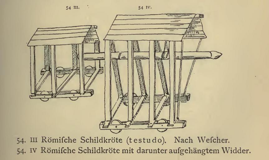 | Keywords: Roman Testudo construction.JPG en Roman mobile shelter called a testudo or tortoise 1869 Die Kriegswaffen in ihrer historischen Entwickelung - von den ältesten Zeiten bis auf die Gegenwart 4th edition 1893 August Friedrich Demmin 1817-1898 other versions PD-old-70-1923 Uploaded with UploadWizard Siege equipment Ancient Roman weapons |