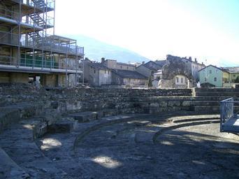 Keywords: Roman Theatre Aosta 1.JPG Picture of the Roman Theatre in Aosta Italy “ View of the cavea in the backgroung working activity aimed to consolidate the monumental facade 2007-01-28 own assumed Laurom Ancient Roman theatre Aosta