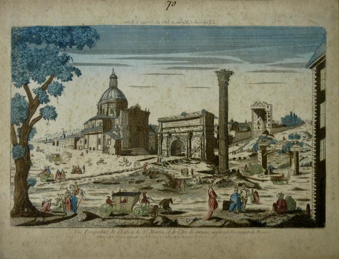 Keywords: RomanForum c1750JacquesChereau.jpg en A View of the Roman Forum by Jacques Chéreau 1688 - 1776 Top Caption L'Eglise de S Martin et l'Arc de Servius a Rome Lower Caption Vue Perspective de l'Eglise de San Martin et de l'Arc de Servius septieme Empereur de Rome A Paris chez Jacques Chereau rue St Jacques au dessus de la Fontaine St Severin faded Translation The Church of St Martin and the Arch of Servius in Rome A Perspective View of the Church of San Martin and of the Arc of Servius the seventh Emperor of Rome In Paris with Jacques Chereau rue St Jacques de la Fontaine above St Severin remainder of legend should have print number unfortunately worn off and faded Top Caption is reversed because Vue Perspective prints are mirror images - intended to be viewed though a Zograscope or similar mirrored and lensed device Vue Perspective prints were made from approximately 1740 to 1820 This image is c 1750 Hand numbered 70 at the top On reverse of print is reversed ink stain 69 Paper is hand-made rag Intaglio engraving with hand applied watercolors 16 5 x 12 875 in // 41 9 cm x 32 7 cm photograph of original print which I own Jacques Chéreau 1688 - 1776 ~ 1750 for the photograph and photoshop editing 41 53 33 34 N 12 29 6 84 E region IT PD-old-100 Column of Phocas Arch of Septimius Severus Rome in art Forum Romanum in art 1750 Engravings of Rome 18th-century engravings Jacques Chereau Peep show cardsPhotographs by Ellin Beltz |