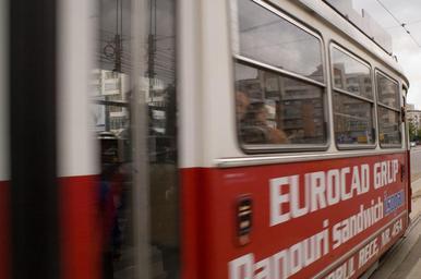 Keywords: romania street car bus transportation mass transit urban passengers outside