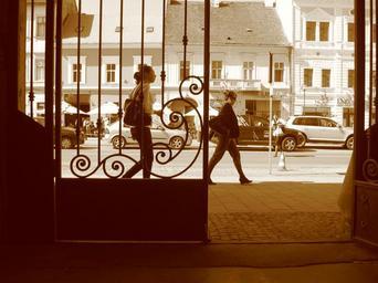 Keywords: romania urban people walking view door doorway black and white sepia street city vehicles