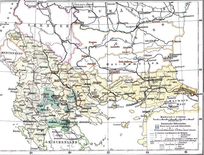 Keywords: Romanian Schools for Aromanians and Meglenoromanians.JPG Румънски училища в акедония п ез 1899 година Rumänische Schulen für Aromunen und Meglenorumänen im Osmanischen Reich 1886 Rumänische Schulen für Aromunen und Meglenorumänen im Osmanischen Reich 1886 als Beispiel für die Durchdringung Makedoniens durch Schulen der Nachbarländer Map showing areas with Romanian schools for Aromanians and Megleno-Romanians in the European side of the Ottoman Empire 1886 Rumanaj lernejoj por arumano-anoj kaj meglenorumano-anoj en la Otomana Imperio 1886 Carte de 1886 montrant les zones où fonctionnaient des écoles roumaines pour les aroumaines dans l'Empire ottoman Şcoli româneşti în Imperiul Otoman 1886 Школы для а умын и меглено умын в Османской импе ии 1886 Osmanlı İmparatorluğundaki Aroman ve Megleno-romanlar 1886 Petermanns Mitteilungen 1899 own scan PD-old Aromanians Megleno-Romanians Maps of the history of modern Romania 1886 1899 Old maps of the Balkans Old maps of the Ottoman Empire Old maps of Turkey Old maps of Greece Old maps of Bulgaria Old maps of Macedonia Old maps of Albania Old maps of Kosovo Old maps of Romania Old maps of Serbia Old maps of Montenegro Maps of the Vlachs Historical maps of ethnic groups in the Balkans Historical maps of ethnic groups in Greece Historical maps of ethnic groups in Albania Historical maps of ethnic groups in the Republic of Macedonia Maps in German |