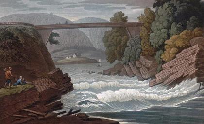 | Keywords: Romantic Bridge, near Skeen (JW Edy plate 38).jpg Artwork Creator John William Edy en Romantic Bridge near Skeen No XXXVIII A ROMANTIC BRIDGE NEAR SKEEN This structure is formed of timber projecting from one rock to another opposite crossing a rapid branch of the waters described in No 37 The present view was taken above the fall and not far from the site of the last Here the eye looking over the fall sees only the rapids below At the time of the melting of the snow and after heavy rains in the mountains the stream becomes prodigiously swollen passing under the bridge with tremendous rapidity and noise tearing the rocks and carrying every thing before it into the Skeen Fiord as seen through the bridge A tremulous motion under the traveller's feet prompts him involuntarily to cling to the sides in passing or in looking on the boiling cauldron below The bridge is about eighty feet in length by ten wide ; its elevation above the water is about fifty feet On the outsides from end to end a little below the parapet which is little more than breast high are projecting points or eaves covered with red pantiles to prevent the horses and travellers from looking perpendicularly down on the gulph The framing consists of mast timber securely bolted together and well inserted and fastened to the rocks on each side; the footway is composed of the small round firs laid as usual side by side at right angles with the parapets It is much frequented by persons going to and from the town and to the ships at the anchoring place in the Fiord on the right In August when this view was taken the water was low and many singular rocks with torn sides presented themselves decorated with a few trees and shrubs The approach to this bridge is well guarded with stone walls The mountains on the opposite side of the Fiord are lofty and their sides well covered with firs pines and birch-trees; the plains and vallies on their tops are studded with well cultivated farms On one of the hills is seen a summer house from the vicinity of which the view No 36 was taken Under it by the water side is seen a farmhouse and a fisherman's hut; in the proper season the salmon are seen leaping this fall to visit the rivers and lakes above from which they seldom return and indeed rarely avoid being speared or taken in snares placed in and about their haunts It is equally curious to observe them when on their return to the sea; being well aware of the fatal consequences of venturing by a perpendicular fall they carefully seek its sides for a smaller descent over which by a violent effort they endeavour to shoot themselves beyond the agitated water at the bottom The man with the fishing rod is endeavouring to catch small fishes that are alarmed at the leap down Collapse bottom http //urn nb no/URN NBN no-nb_digibok_2011072910001 Boydell's picturesque scenery of Norway London 1820 Plate no 38 p 221 in scanned copy no-nb_digibok_2011072910001 PD-Art-100 John William Edy Boydell's picturesque scenery of Norway Bridges in Telemark Skien Angling in art Geography of Telemark Telemark in art |