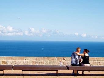 Keywords: romantic love romance couple relationship outdoors people female together male woman young lovely loving relation emotion sea blue wizzair boat airplane clouds view hug