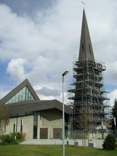 Keywords: roof damage church steeple tower slate integrated scaffold cross great spire grey building modern architecture concrete fair faced concrete concrete buildings roof construction front window input range forecourt mater dolorosa langenau