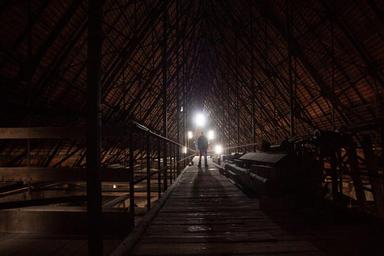 Keywords: roof roof construction steel structure wood wooden beams steel concrete over the nave münster ulm cathedral building church ulm city architecture man back light incidence of light web railing