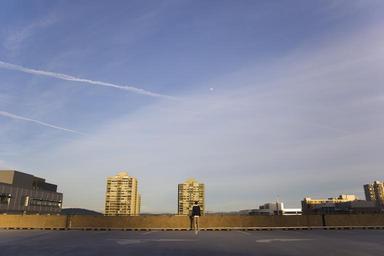 Keywords: rooftop parking garage parking lot pavement blue sky apartments buildings man guy people