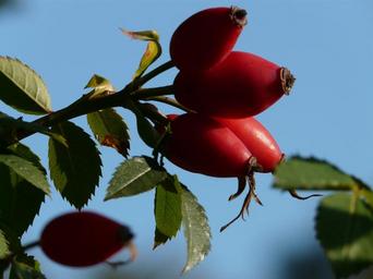 Keywords: rose hip fruit sammelfrucht red dog rose rosa canina hageman rose wild rose blue sky