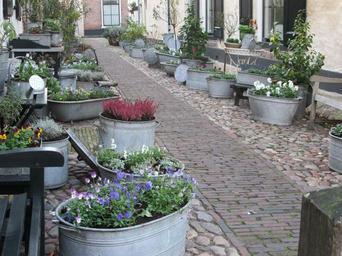Keywords: rose historical village street historical center side street zinc bowl flowers