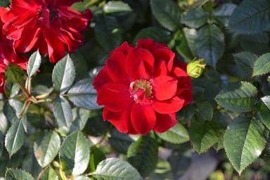 Keywords: rose red floribunda close-up green leaves petals red rose deep red