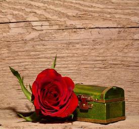 Keywords: rose red flower blossom bloom treasure chest red rose deco casket treasure valuable wood greeting card