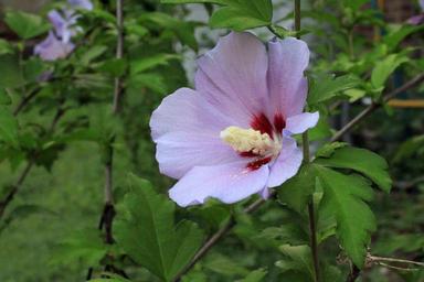 Keywords: rose sharon rose of sharon leaves green leaves pink flower summer spring flower nature fauna flora pink lavender purple pistol morning
