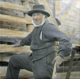 | Keywords: lysbilder portretter mennesker menn fartøyer skip kvinnherad hordaland norge nor people outdoor Håndkolorert dias. En mann med hatt og vest står med ene foten og hånda på en trestige, i den andre hånda holder han et redskap, antakelig en øks. Håndkolorert dias. En mann med hatt og vest står med ene foten og hånda på en trestige, i den andre hånda holder han et redskap, antakelig en øks. | ||||