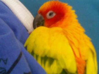 Keywords: Rossyyyy.JPG en Sun Conure being playful and sitting in my lap Stacieee Stacieee Aratinga solstitialis captive Aratinga heads