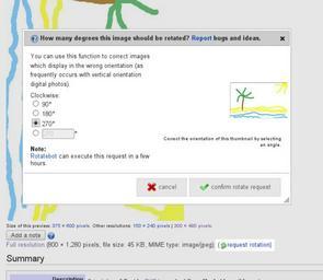 | Keywords: RotateRequest, Gadget-RotateLink - 2011-11-23, en.png -pages 2011-10-14 21 37 UTC Script Rillke AaatestSonnepalmenstrand90 jpg and screenshot Saibo Icons See Icon attribution Previous version 2011-10-14 File RotateRequest Gadget-RotateLink png arranged highlighted the rotate request link Saibo Script itself see MediaWiki RotateRequest js Screen elements should be PD-ineligible The artwork is Beerware Cc-zero Icons See Icon attribution Original upload log This image is a derivative work of the following images File AaatestSonnepalmenstrand90 jpg licensed with Beerware Cc-zero 2011-10-14T21 16 01Z Saibo 1280x800 38830 Bytes <nowiki>Reverted to version as of 17 07 9 October 2011</nowiki> 2011-10-10T19 55 58Z Rotatebot 1280x800 44398 Bytes <nowiki>Bot Image rotated by 180° EXIF-Orientation set from 6 to 1 rotated 270° </nowiki> 2011-10-10T19 54 49Z Saibo 1280x800 38830 Bytes <nowiki>Reverted to version as of 17 07 9 October 2011</nowiki> 2011-10-09T20 58 42Z Rotatebot 1280x800 44398 Bytes <nowiki>Bot Image rotated by 180° EXIF-Orientation set from 6 to 1 rotated 270° </nowiki> 2011-10-09T20 55 50Z Luxo 1280x800 38830 Bytes <nowiki>Reverted to version as of 17 07 9 October 2011</nowiki> 2011-10-09T19 11 22Z Rotatebot 1280x800 44398 Bytes <nowiki>Bot Rotate 180°</nowiki> 2011-10-09T17 07 50Z Saibo 1280x800 38830 Bytes <nowiki> Orientation 6 Test for EXIF bugs please keep fingers away ; own 2011-10-09 ~~~ beerware Test images</nowiki> Uploaded with derivativeFX ImageNote 1 453 503 125 28 681 591 2 LangSwitch Start-Link Bild drehen The start link request rotation Le lien faire pivoter ImageNoteEnd 1 ImageNote 2 485 174 122 77 681 591 2 LangSwitch Bitte warte bei älteren Uploads bis das Vorschaubild angezeigt wird When requesting rotation for old uploads please wait until this thumbnail displays Pour obtenir un aperçu de la rotation attendez que l'image de prévisualisation se mette à jour ImageNoteEnd 2 ImageNote 3 67 251 17 17 681 591 2 LangSwitch Diese Gradzahl-Option wurde vom Benutzer ausgewählt damit das kleine Bild auf der rechten Seite korrekt ausgerichtet ist This degree option was selected by the user to get the thumbnail on the right side orientated correctly ImageNoteEnd 3 Commons screenshots en Screenshots of MediaWiki gadgets |
