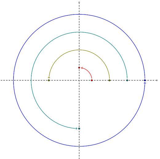 Keywords: Rotations on the complex plane.svg Four numbers on the real line are multiplied by integer powers of the imaginary unit which corresponds to rotations by multiples of the right angle Self-made Written in TeX with TikZ compiled using <code>latex rot tex dvisvgm -n -c1 75 rot dvi</code> Ke r TeX source <source lang latex > \documentclass article \usepackage amsmath \usepackage amsfonts \usepackage tikz \usepackage scalefnt \begin document \pagestyle empty \def\rotarc 1 2 3 4 5 \draw 2 fill 2 1 0 circle 0 03 ; \draw 2 fill 2 1 cos 3 1 sin 3 circle 0 03 ; \drawthick -> 2 1 0 075 arc asin 0 075/ 1 3/2 1 node anchor 5 4 arc 3/2 3-asin 0 075/ 1 1 ; \begin tikzpicture scale 2 \drawdashed -> -3 1 0 -- 3 1 0 node anchor north Re ; \drawdashed -> 0 -3 1 -- 0 3 1 node anchor west Im ; \rotarc 0 5 red 90 i 1 i south west \rotarc 1 2 olive 180 i 2 -1 south west \rotarc 1 9 teal 270 i 3 -i south east \rotarc 2 6 blue 360 i 4 1 south east \end tikzpicture \end document </source> Mathematical diagrams Complex plane Rotation Euclidean plane Cc-zero |