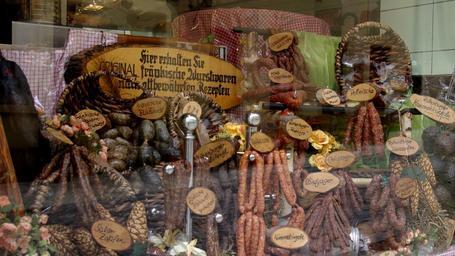 Keywords: Rothenburg ob der Tauber Metzgerei 001.JPG Metzgerei in Rothenburg ob der Tauber own Janericloebe 2010-05 Shops in Rothenburg ob der Tauber Sausages of Franconia Butcher's shops in Bavaria Meat displays