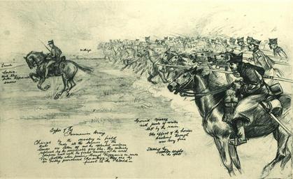 | Keywords: Roumania's magnificent cavalery - Troopers of renown in the army of our new ally.jpg Roumania's magnificent cavalery - Troopers of renown in the army of our new ally <br> IN THE FIELD GREY OF MODERN WAR; NO BRILLIANT PEACE-TIME UNIFORMS OR LANCE-PENNONS ROUMANIAN CAVALRY CHARGING <br> In the popular regard of the nation the Roumanian cavalry are considered crack troops the ink of the service The men are good riders and of excellent physique are thoroughly disciplined and know their business They are well mounted on a first-rate type of horse native to the country Brilliantly uniformed in time of peace ”hardly the German or the Austrian hussars were more showily attired ”the Roumanian cavalry are now wearing the severely plain and stern-looking field-grey which all the Allied troops in the war have adopted where khaki is not worn Our artist sends this note recording an experience with the Roumanian cavalry on the day he made the above sketch There was some difference of opinion among certain officers as to whether the ordinary uniform or field-grey looked most impressive for cavalry from an enemy's point of view in a charge Two regiments the one attired in the peace-time uniform with fluttering pennons on their lances and the other in field-grey were turned out and ordered to charge so as to put the matter to a test I was asked to act as judge writes our war-artist and I gave my opinion in favour of field-grey The full-dress uniforms made a glittering display of colour but the field-grey troopers in the mass looked more formidable heavier and more sternly business-like as the onrush of horsemen swept by their lance-poles bare only tipped with gleaming points of steel --Drawing Copyrighted in the United States and Canada The Illustrated London News p 308 1916-09-09 Henry Charles Seppings-Wright 1850-1937 PD PD-art 1916 in Romania ILN 1916 Henry Charles Seppings-Wright Romania in World War I Participarea României la Primul Război Mondial reflectată în artă |