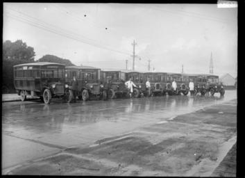 | Keywords: blackandwhite monochrome outdoor photo border black and white View of 9 Passenger Transport Company buses parked in Otahuhu. Their drivers are standing beside the buses wearing uniform, some in white coats. Most of the buses have signs reading Otahuhu, and some say "via Ellerslie". A couple have Papatoetoe as the direction they will travel. Photograph taken by William A Price circa 1920s Quantity: 1 b&w original negative(s). Physical Description: Dry glass plate negative 4.75 x 6.5 inches Row of Passenger Transport Company buses and drivers, Otahuhu. Price, William Archer, 1866-1948 :Collection of post card negatives. Ref: 1/2-000503-G. Alexander Turnbull Library, Wellington, New Zealand. natlib.govt.nz/records/22749141 View of 9 Passenger Transport Company buses parked in Otahuhu. Their drivers are standing beside the buses wearing uniform, some in white coats. Most of the buses have signs reading Otahuhu, and some say "via Ellerslie". A couple have Papatoetoe as the direction they will travel. Photograph taken by William A Price circa 1920s Quantity: 1 b&w original negative(s). Physical Description: Dry glass plate negative 4.75 x 6.5 inches Row of Passenger Transport Company buses and drivers, Otahuhu. Price, William Archer, 1866-1948 :Collection of post card negatives. Ref: 1/2-000503-G. Alexander Turnbull Library, Wellington, New Zealand. natlib.govt.nz/records/22749141 |